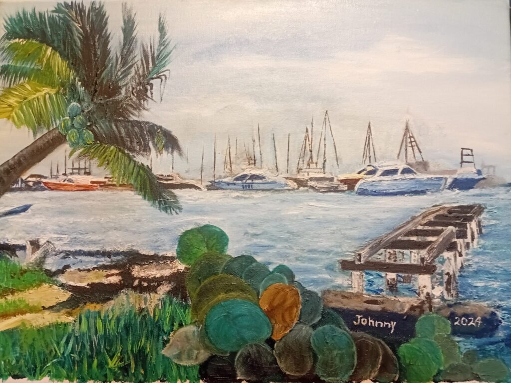 En esta escena artística se puede apreciar la armonía y el contraste, en la quietud de un puerto donde la atmósfera presenta un cielo de nubes cargadas, donde el atardecer plomizo se funde en pinceladas suaves y etéreas.